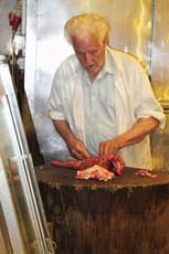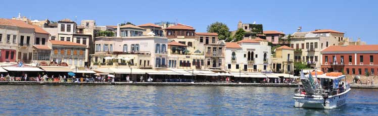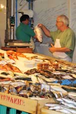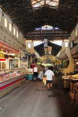 Vanaf het busstation is het maar een kleine wandeling tot in het oude stadsgedeelte. Eerst gaan we naar de markt. In Chania vind je nog een van de zeldzame overdekte markten van Kreta. Naast de slagers, groente- en viskramen, ook heel wat stands met honing, kruiden, olijfolie, wijn en andere streekproducten. Er zijn ook enkele eenvoudige restaurantjes. In een kruidenwinkeltje laten we ons verleiden tot het kopen van enkele zakjes met kruiden. Nu zal thuis onze moussaka, gyros en tzatziki smaken zoals hier. Toch!? .
