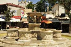 We slenteren rond en komen toch terecht op het pleintje rond de Morosinifontein. Hier is het best gezellig. Tijd voor een terrasje en een verfrissend drankje want het is vandaag snikheet. Rond deze fontein speelt zich een groot deel van de activiteit in Heraklion zich af.